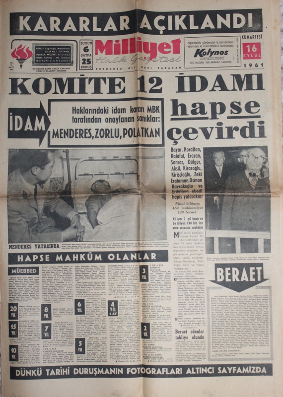 Milliyet Gazetesi 16 Eylül 1961 - Komite 12 İdamı Hapse Çevirdi
