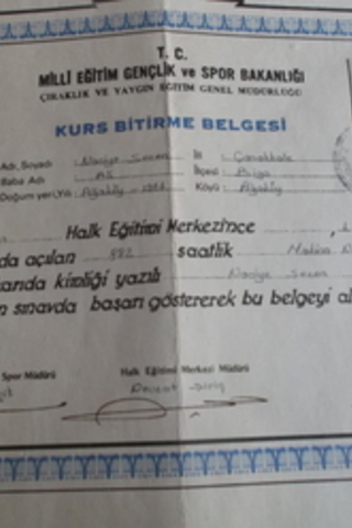 Biga Çıraklık Eğitim Merkezince Naciye Sezen Hakkında Makine Nakış Bölümü kursunu tamamladığına dair kurs bitirme belgesinden ibarettir.