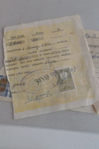 1977 yılına ait üzerinde 1TL'lik pul yapıştırılı bir adet senet parçası 1975 tarihinde düzenlenmiş üzerinde 3 adet zamanın damga pulu olan makbuz