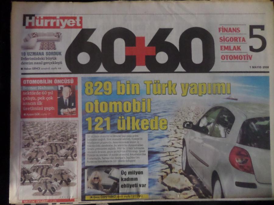 Hürriyet Gazetesi 1 Mayıs 2008 - 60+60 Finans Sigorta Emlak Otomotiv 5 - 829 Bin Türk Yapımı Otomobil 121 Ülkede