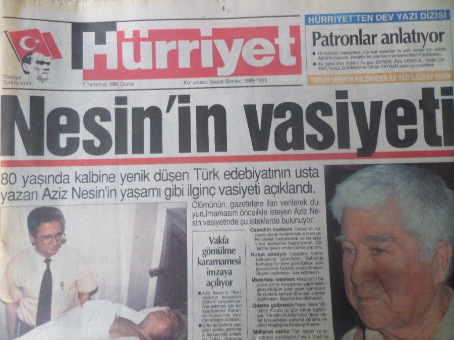 Hürriyet Gazetesi 7 Temmuz 1995 - Nesin'in Vasiyeti